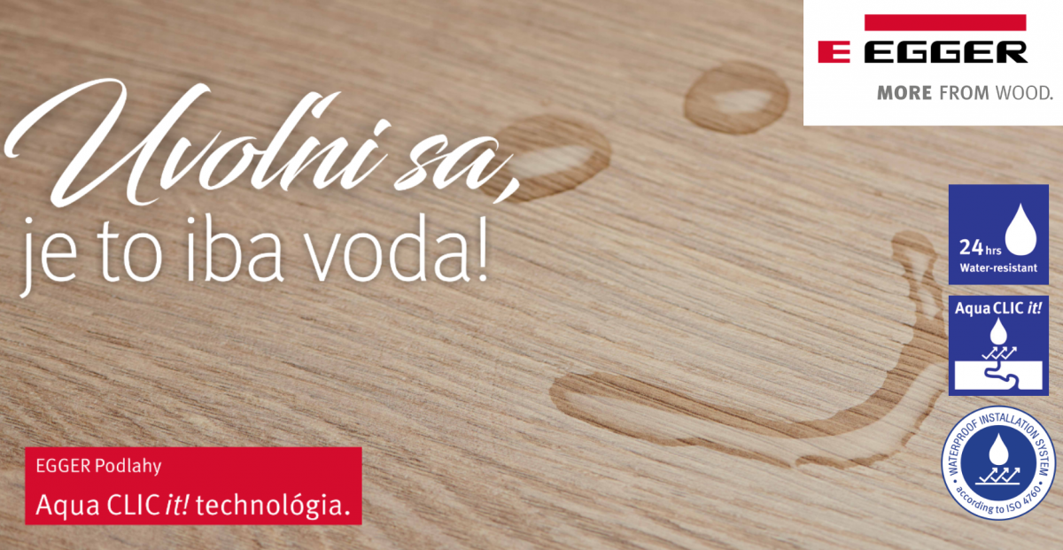 - Nová technológia u podláh EGGER Laminát: vodotesný inštalačný systém Aqua CLIC it!, ktorý spoľahlivo chráni pred prenikaním vlhkosti po dobu 24 hod.