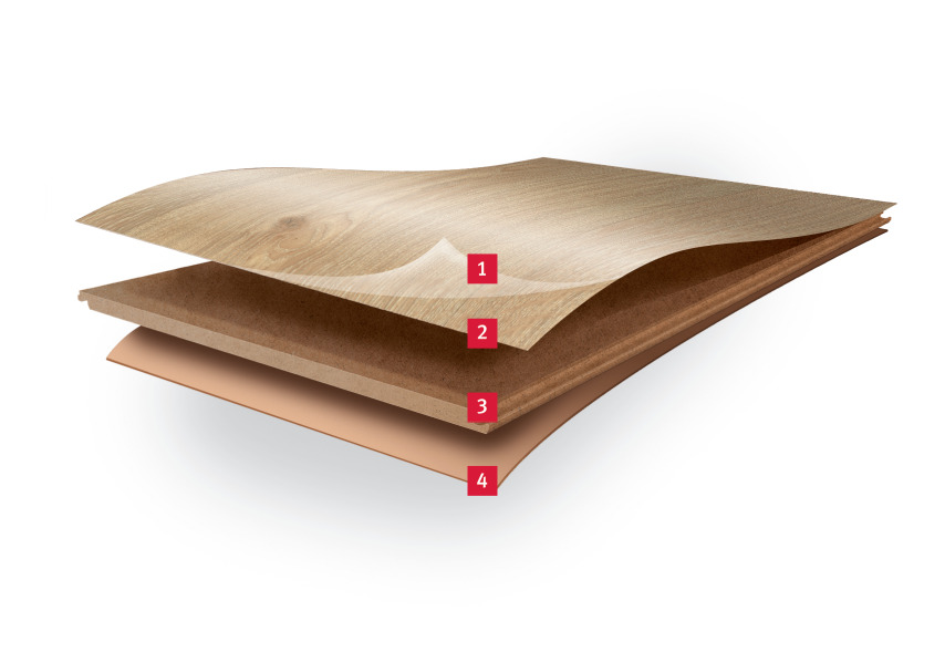 Zloženie laminátovej podlahy EGGER: 1- Vysoko odolný povrch; 2- Vrstva dekoru; 3- Nosná doska HDF Quell Stop Plus; 4- Protiťahový papier