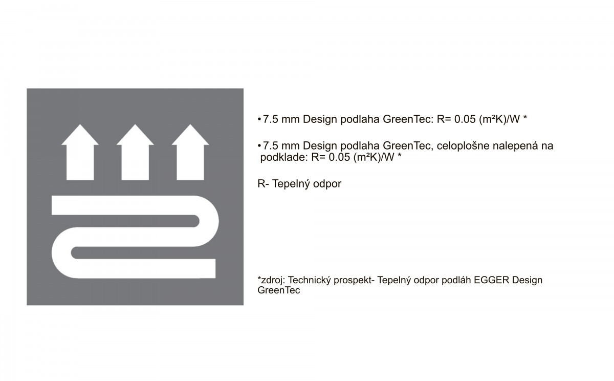 Kompozitná podlaha Design GreenTec vďaka optimálnej hrúbke 7,5 mm a vysokej hustote nosnej dosky GreenTec má nízky tepelný odpor (R), len 0.05 m2*K/W a preto je vhodná na elektrické ako aj teplovodné podlahové vykurovanie. Vďaka integrovanej korkovej podložke, nie je potrebné pri pokládke podlahy použiť žiadnu ďalšiu podložku.