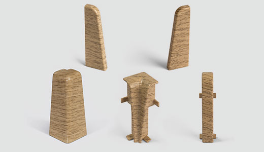 Vonkajšie a vnútorné rohové prvky, koncovky a spojovacie prvky sa hodia k 60 mm soklovým lištám EGGER a sú k dispozícií v 24 drevodekoroch a 3 uni farbách ( biela, strieborná, čierna). Ich použitím nemusíte soklové lišty zložito zarezávať.