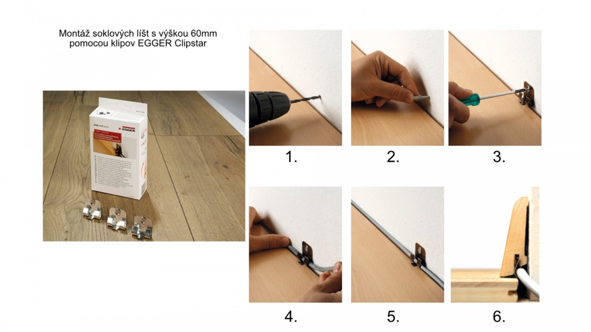 Montáž soklových líšt EGGER 60 mm pomocou úchytov EGGER Clipstar