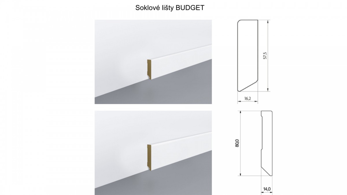 Moderné biele hranaté soklové lišty BUDGET majú rovnaké vlastnosti ako lišty CUBICAL. Sú zhotovené z MDF jadra a vodoodpudivej fólie a pred samotnou inštaláciou sa môžu v prípade potreby natrieť akrylovou farbou. V našej ponuke sú dostupné v 2 rôznych výškach a šírkach. Lišty spoľahlivo prekryjú dilatačnú špáru medzi stenou a podlahou.