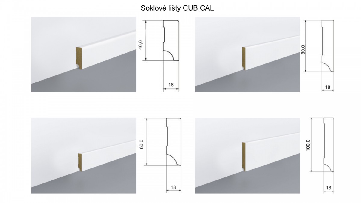 S modernými hranatými soklovými lištami CUBICAL v bielej farbe s minimalistickým lineárnym charakterom skrášlite svoj interiér a vytvoríte v ňom pôsobivý dojem. Lišty CUBICAL, rovnako ako lišty HAMBURG, sú zhotovené z MDF jadra a vodoodpudivej fólie, ktorá sa môže v prípade potreby natierať akrylovou farbou. Slúžia na prekrytie dilatačných špár medzi podlahou a stenou, ktoré vzniknú pri pokládke podlahy. Montujú sa lepením alebo kompresným klincovaním. Lišty sú dostupné v 4 rôznych výškach, čo vám zaručí, že si vyberiete vždy tu správnu lištu, ktorá dokonale zapadne do vášho interiéru.