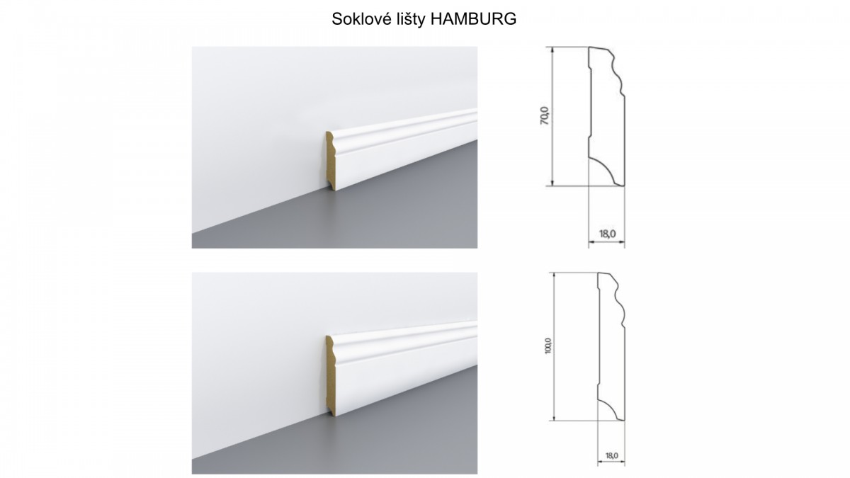 Biele profilované soklové lišty HAMBURG vás očaria svojím jednoduchým a zároveň zaujímavým vzhľadom. Perfektne sa hodia do moderného, ale aj vintage štýlu interiéru. Vytvárajú pôsobivý dojem, dodajú podlahe čisté ukončenie a dokonalý, atraktívny vzhľad. S lištou HAMBURG prekryjete dilatačné medzery medzi podlahou a stenou veľmi štýlovým spôsobom. Lišty si môžete vybrať v dvoch výškach: 70 mm alebo 100 mm. Robustné krycie lišty sú zhotovené z MDF jadra a vodoodpudivej fólie, ktorá sa môže v prípade potreby natierať akrylovou farbou. Farbu lišty si tak môžete prispôsobiť k farbe steny. Lišty odporúčame natrieť ešte pred ich samotnou inštaláciou. Nainštalovať ich môžete pomocou montážneho lepidla alebo kompresným klincovaním.